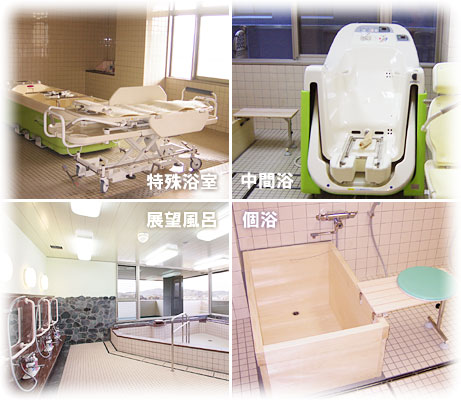 浴室は、個浴(8ヶ所。うち中間浴と併用が2ヶ所)、特殊浴室(1ヶ所)、展望風呂(1ヶ所)があり、入浴もリハビリの一環であり、大切なふれあいの場所と考えております。